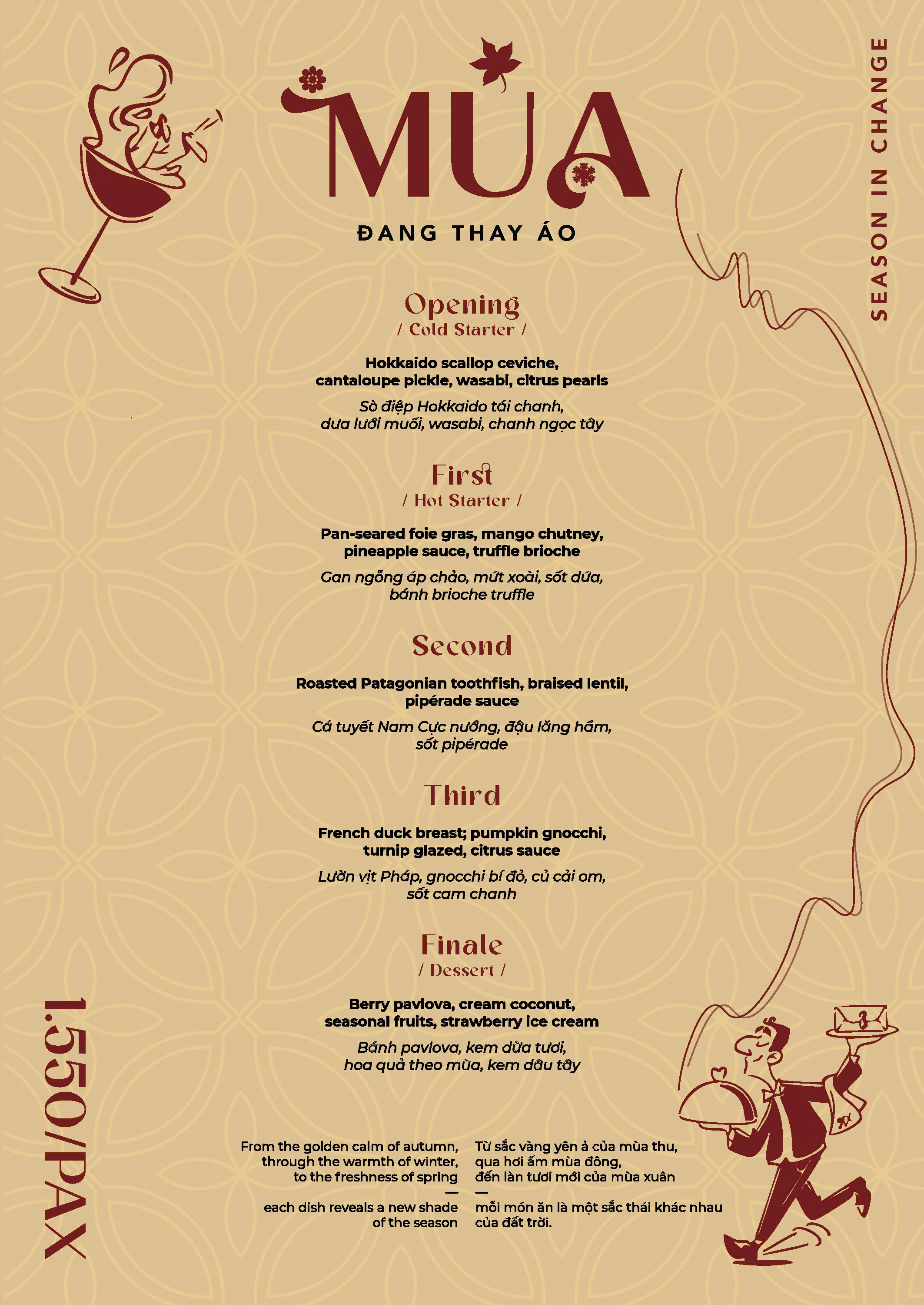 長年にわたる料理への情熱と探求の中で、シェフ・ホンは独自のスタイルを築き上げました。上質な西洋食材とベトナム料理の伝統に根ざしたインスピレーションを融合させ、現代的でありながらも深い伝統を感じさせる料理を生み出しています。