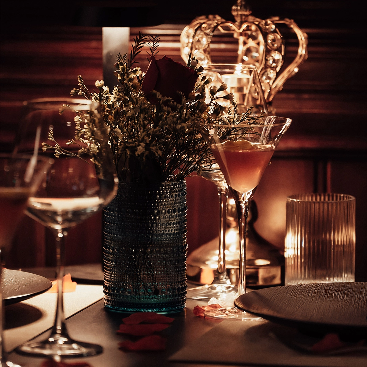 夜には、レストランは親密なディナーに最適な空間へと姿を変え、 隅々までこだわり抜かれた演出で特別なひとときをお届けします。