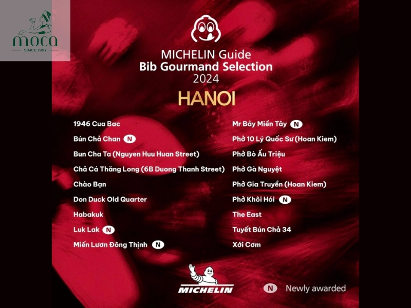 - Bib Gourmand: 1946 Cua Bac, Xới Cơm, Bún Chả Chan (mới), Luklak (mới), Bún Chả Ta (phố Nguyễn Hữu Huân), Chả Cá Thăng Long, Chào Bạn, Don Duck Old Quarter, Tuyết Bún Chả 34, Habakuk, Phở 10 Lý Quốc Sư (Hoàn Kiếm), Phở Bò Ấu Triệu, Phở Khôi Hói (mới), Phở Gia Truyền (Hoàn Kiếm), Phở Gà Nguyệt, Mr Bảy Miền Tây (mới), Miến Lương Đông Thịnh (mới), The East
